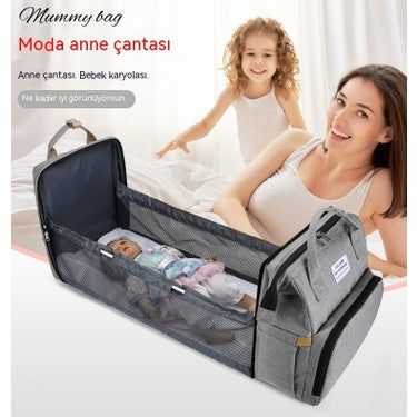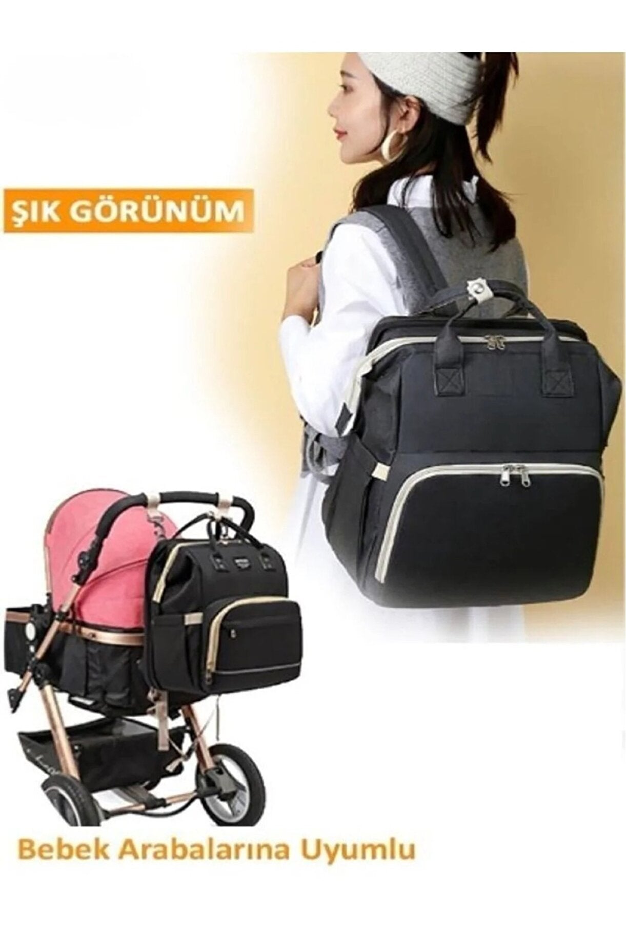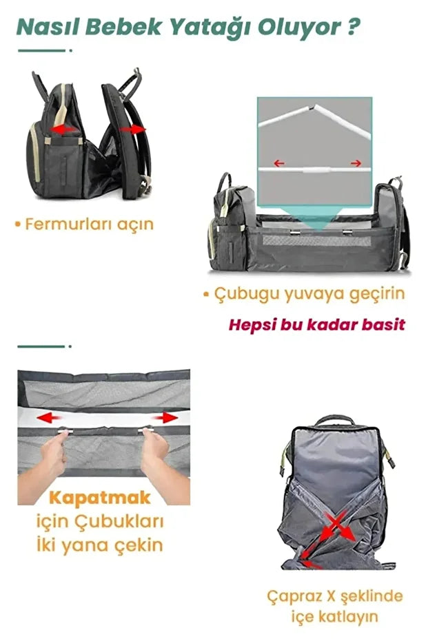 ✅ Evet! Çantanın arka bölümü açılarak pratik bir şekilde portatif yatağa dönüşür. Yan destekler ve cibinlik aparatı ile bebeğiniz için güvenli bir uyku alanı sunar.